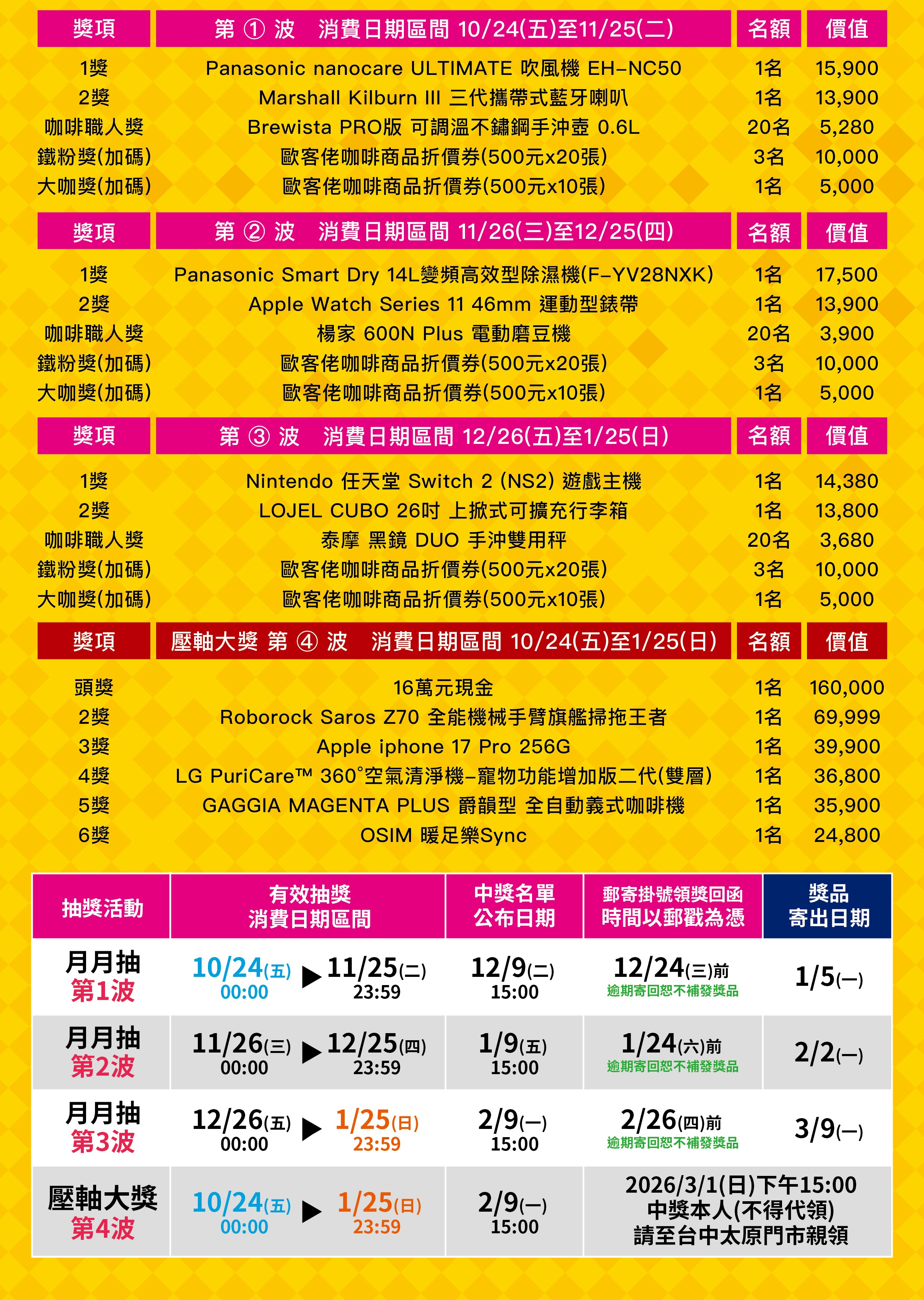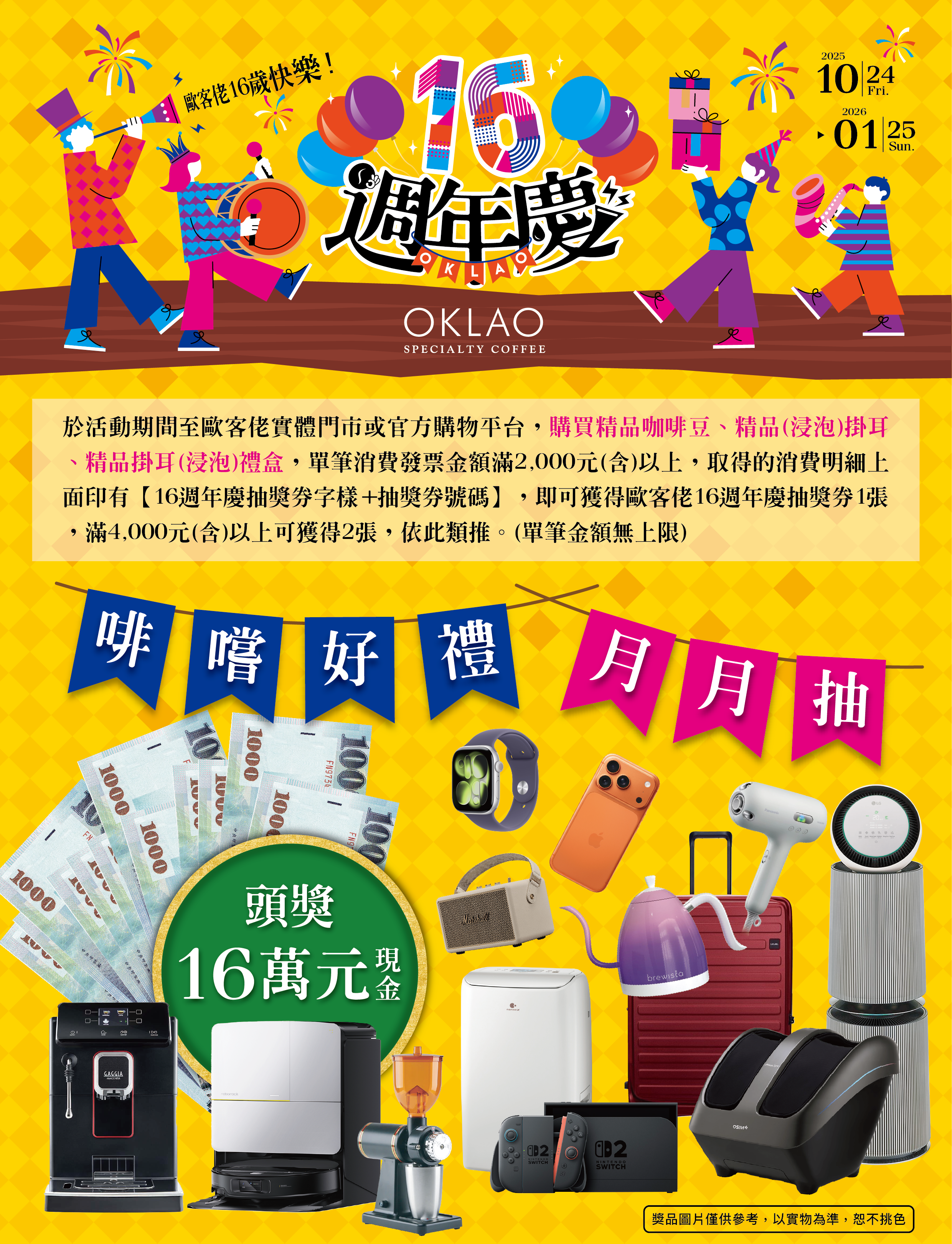 2025 歐客佬16週年慶 啡嚐好禮 月月抽 10/24(五)-1/25(日)